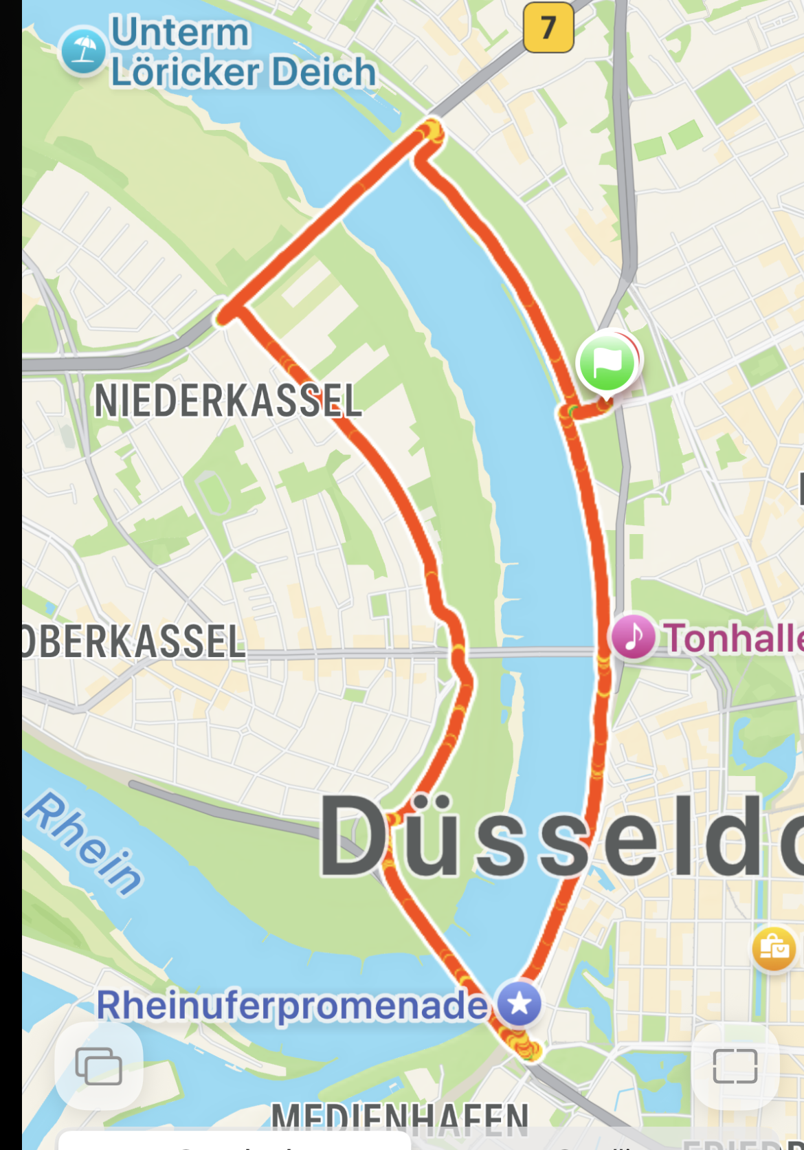Von der Stadt Düsseldorf wird die Strecke „Große Brückenrunde“ genannt. Vom Oberlandesgericht zur Theodor-Heuss-Brücke, rüber zum linken Rheinufer, stromaufwärts bis zur Rheinknie-Brücke, zurück auf rechte Ufer und dort entlang zurück zum Oberlandesgericht.