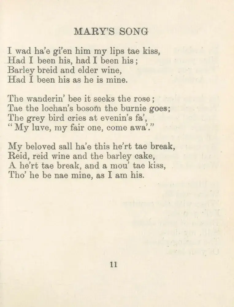 <p>I wad ha’e gi’en him my lips tae kiss,<br>Had I been his, had I been his…</p><p>—“Mary’s Song”, by Marion Angus (1865–1946) – born <a href="/tags/otd/" rel="tag">#OTD</a>, 27 March<br>published in THE TINKER’S ROAD and Other Verses (1924)</p><p>“She has an authentic voice straight out of the ballad tradition, an eerie shimmer to her best poems”<br>—Kathleen Jamie</p><p><a href="https://digital.nls.uk/works-by-selected-scottish-authors/archive/129188342#?c=0&m=0&s=0&cv=12&xywh=-880%2C-256%2C3153%2C2337" rel="nofollow" class="ellipsis" title="digital.nls.uk/works-by-selected-scottish-authors/archive/129188342#?c=0&m=0&s=0&cv=12&xywh=-880%2C-256%2C3153%2C2337"><span class="invisible">https://</span><span class="ellipsis">digital.nls.uk/works-by-select</span><span class="invisible">ed-scottish-authors/archive/129188342#?c=0&m=0&s=0&cv=12&xywh=-880%2C-256%2C3153%2C2337</span></a></p><p><a href="/tags/scottish/" rel="tag">#Scottish</a> <a href="/tags/literature/" rel="tag">#literature</a> <a href="/tags/poem/" rel="tag">#poem</a> <a href="/tags/poetry/" rel="tag">#poetry</a> <a href="/tags/20thcentury/" rel="tag">#20thcentury</a> <a href="/tags/womenwriters/" rel="tag">#womenwriters</a> <a href="/tags/scots/" rel="tag">#Scots</a> <a href="/tags/scotslanguage/" rel="tag">#Scotslanguage</a></p>