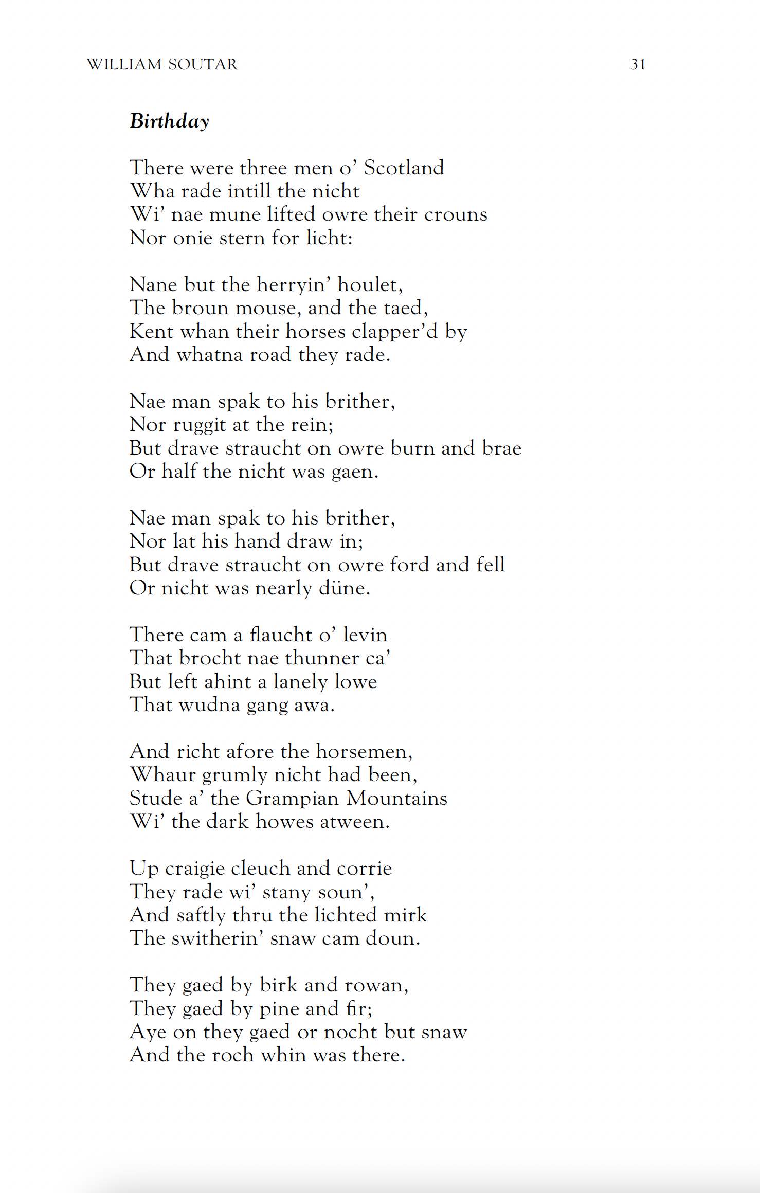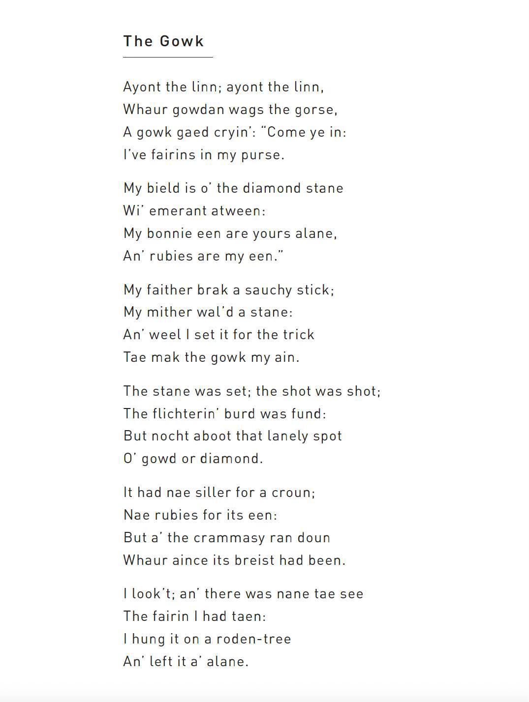 <p>Ayont the linn; ayont the linn,<br>Whaur gowdan wags the gorse,<br>A gowk gaed cryin’: “Come ye in:<br>I’ve fairins in my purse…”</p><p>—William Soutar, “The Gowk”<br>published in Collected Published Poetry (Tippermuir, 2024)</p><p>April Fool’s Day is Huntigowk Day in Scotland</p><p><a href="https://tippermuirbooks.co.uk/product/william-soutar-collected-works-vols-1-2/" rel="nofollow" class="ellipsis" title="tippermuirbooks.co.uk/product/william-soutar-collected-works-vols-1-2/"><span class="invisible">https://</span><span class="ellipsis">tippermuirbooks.co.uk/product/</span><span class="invisible">william-soutar-collected-works-vols-1-2/</span></a></p><p><a href="/tags/scottish/" rel="tag">#Scottish</a> <a href="/tags/literature/" rel="tag">#literature</a> <a href="/tags/poem/" rel="tag">#poem</a> <a href="/tags/poetry/" rel="tag">#poetry</a> <a href="/tags/scots/" rel="tag">#Scots</a> <a href="/tags/scotslanguage/" rel="tag">#Scotslanguage</a> <a href="/tags/april1st/" rel="tag">#April1st</a></p>
