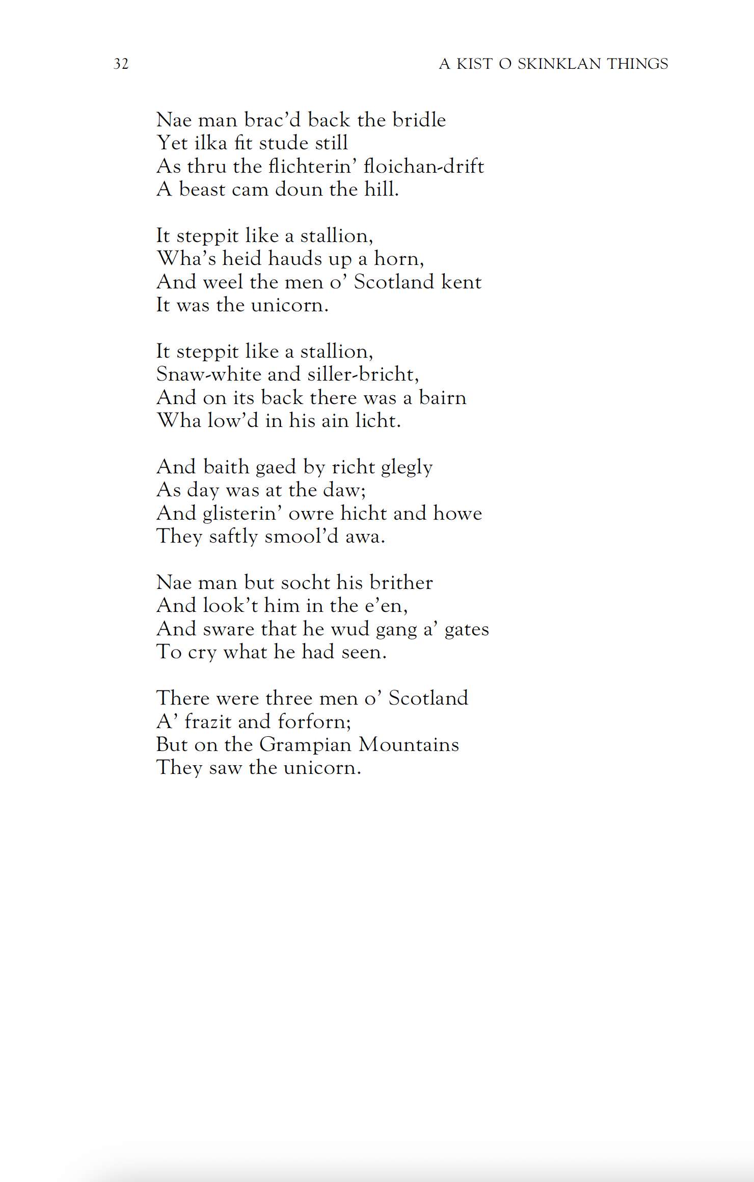 <p>It steppit like a stallion,<br>Wha’s heid hauds up a horn,<br>And weel the men o’ Scotland kent<br>It was the unicorn…</p><p>—William Soutar (1898–1943), “Birthday”</p><p>Another poem for National Unicorn Day 🦄 🏴</p><p><a href="https://asls.org.uk/publications/books/volumes/a-kist-o-skinlan-things/" rel="nofollow" class="ellipsis" title="asls.org.uk/publications/books/volumes/a-kist-o-skinlan-things/"><span class="invisible">https://</span><span class="ellipsis">asls.org.uk/publications/books</span><span class="invisible">/volumes/a-kist-o-skinlan-things/</span></a> </p><p><a href="/tags/scottish/" rel="tag">#Scottish</a> <a href="/tags/literature/" rel="tag">#literature</a> <a href="/tags/poem/" rel="tag">#poem</a> <a href="/tags/poetry/" rel="tag">#poetry</a> <a href="/tags/20thcentury/" rel="tag">#20thcentury</a> <a href="/tags/scots/" rel="tag">#Scots</a> <a href="/tags/scotslanguage/" rel="tag">#Scotslanguage</a> <a href="/tags/nationalunicornday/" rel="tag">#NationalUnicornDay</a> <a href="/tags/unicorn/" rel="tag">#unicorn</a></p>