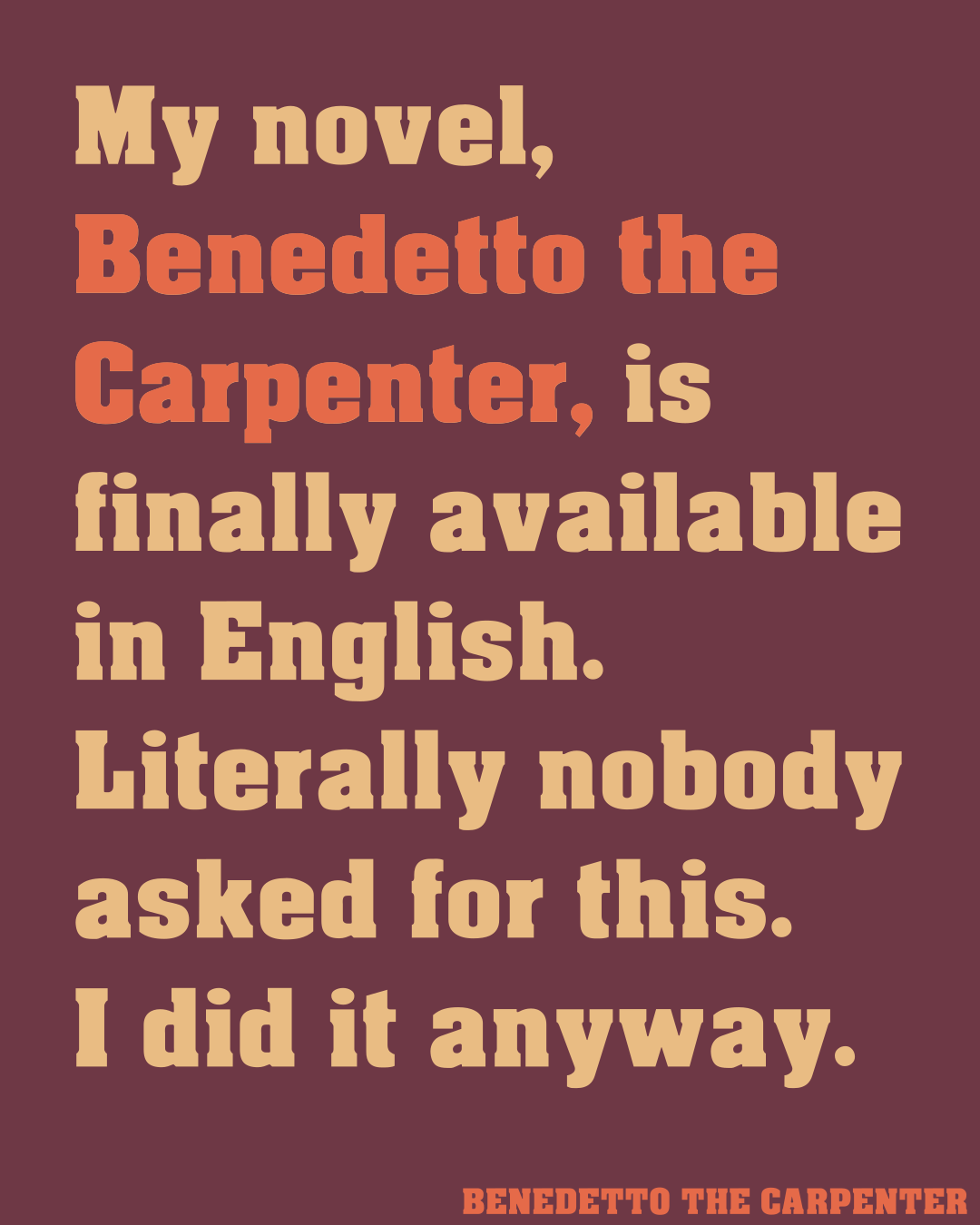 <p>friends and followers! the English edition of my novel Benedetto the Carpenter is now available at this link <a href="https://mybook.to/BenedettotheCarpenter" rel="nofollow" class="ellipsis" title="mybook.to/BenedettotheCarpenter"><span class="invisible">https://</span><span class="ellipsis">mybook.to/BenedettotheCarpente</span><span class="invisible">r</span></a></p><p>I hope you'll have as much fun reading it as I had translating it 🪚🔨 🪵 🤬</p><p><a href="/tags/libri/" rel="tag">#libri</a> <a href="/tags/books/" rel="tag">#books</a> <a href="/tags/libros/" rel="tag">#libros</a> <a href="/tags/livros/" rel="tag">#livros</a></p>