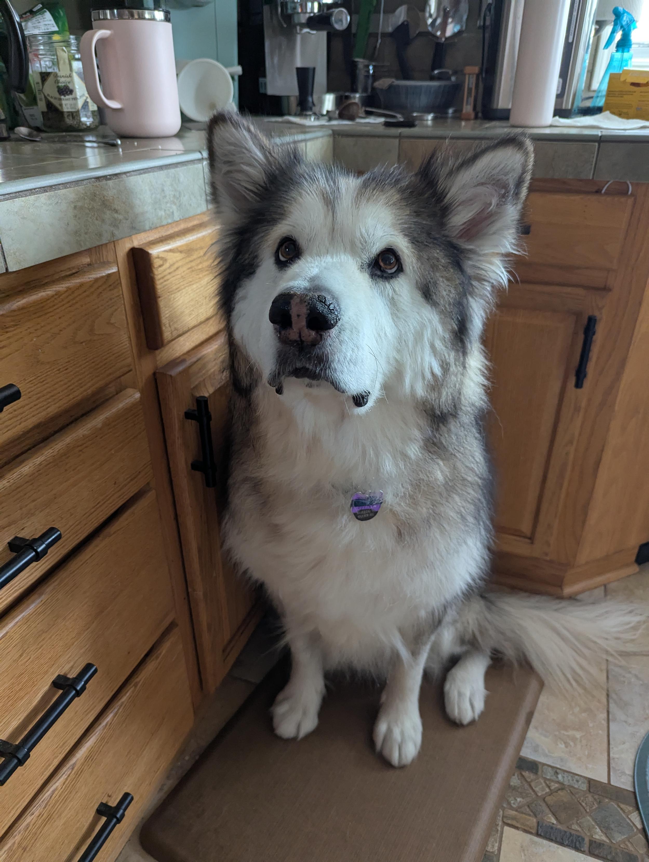 Look at this cute little punk waiting patiently for a piece of chimken.