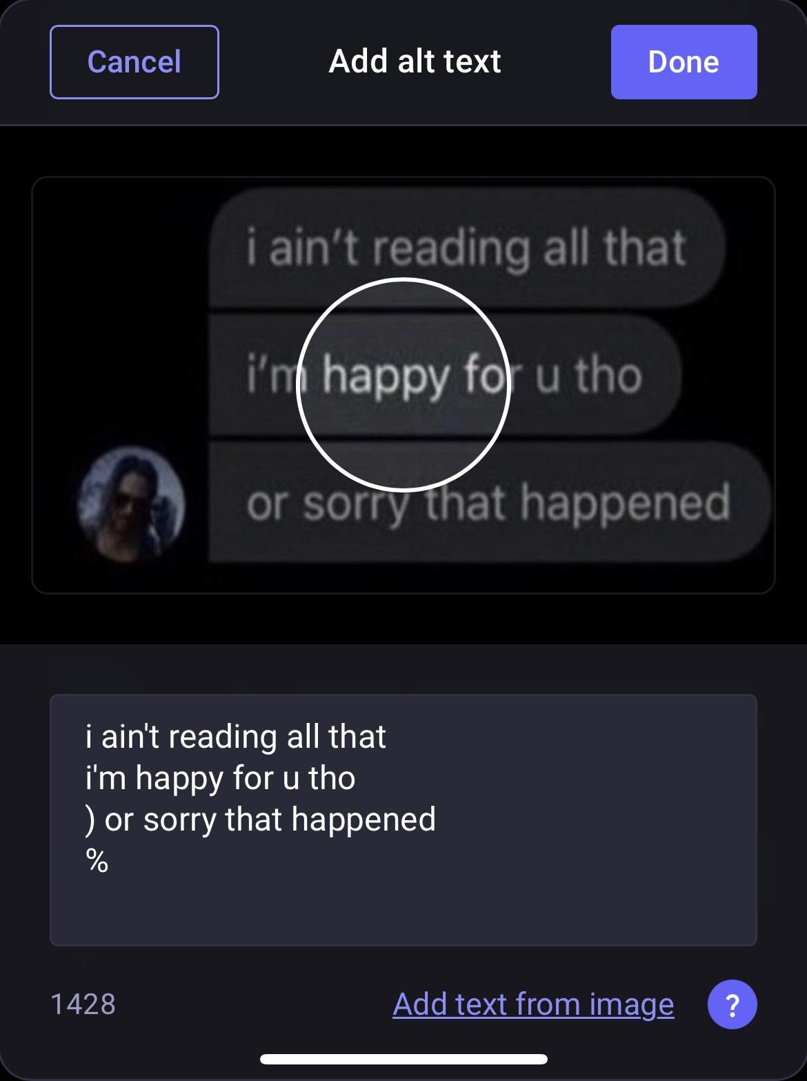 But I’m far from the first to say this: AltText is not really optional on #Mastodon. Many UIs (web particularly) can detect text in images. You probably need to edit, but it’s a head start over typing it all by hand.