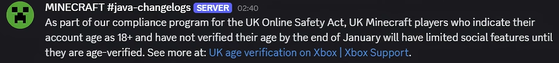#互联网抗癌记 2026年1月,Microsoft 迫于英国互联网安全法的淫威,要求所有居住在英国并且声称自己账户年龄大于 18 岁的 Xbox Network 用户在月底前验证自己的年龄,否则其账户的社交功能会受到限制。受波及的游戏包括 #Minecraft 。