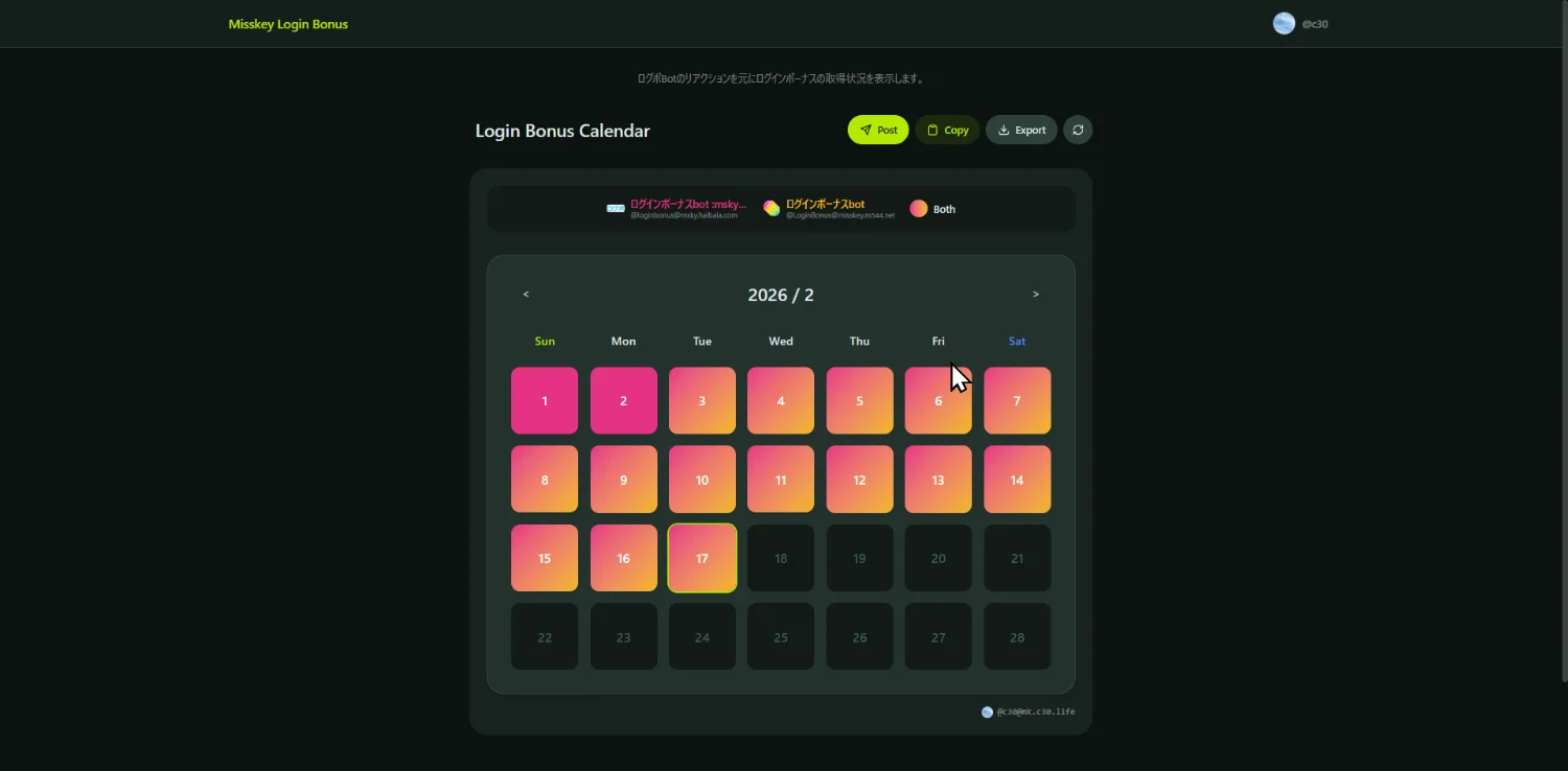#MIKUexpo2025 #misskey #hatsunemiku #anime #imagen4ログインボーナスBotからのリアクション履歴をカレンダー形式で表示するWebアプリです。