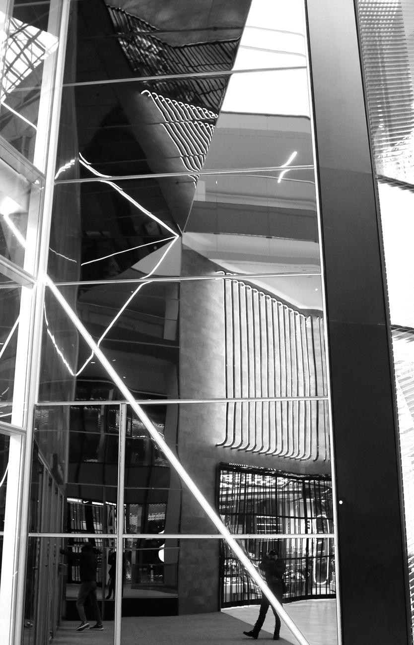 Minimalist Black and White image of a foggy, peaceful scenery on Lake Washington as a rowboat with a solitary figure emerging from the fog.