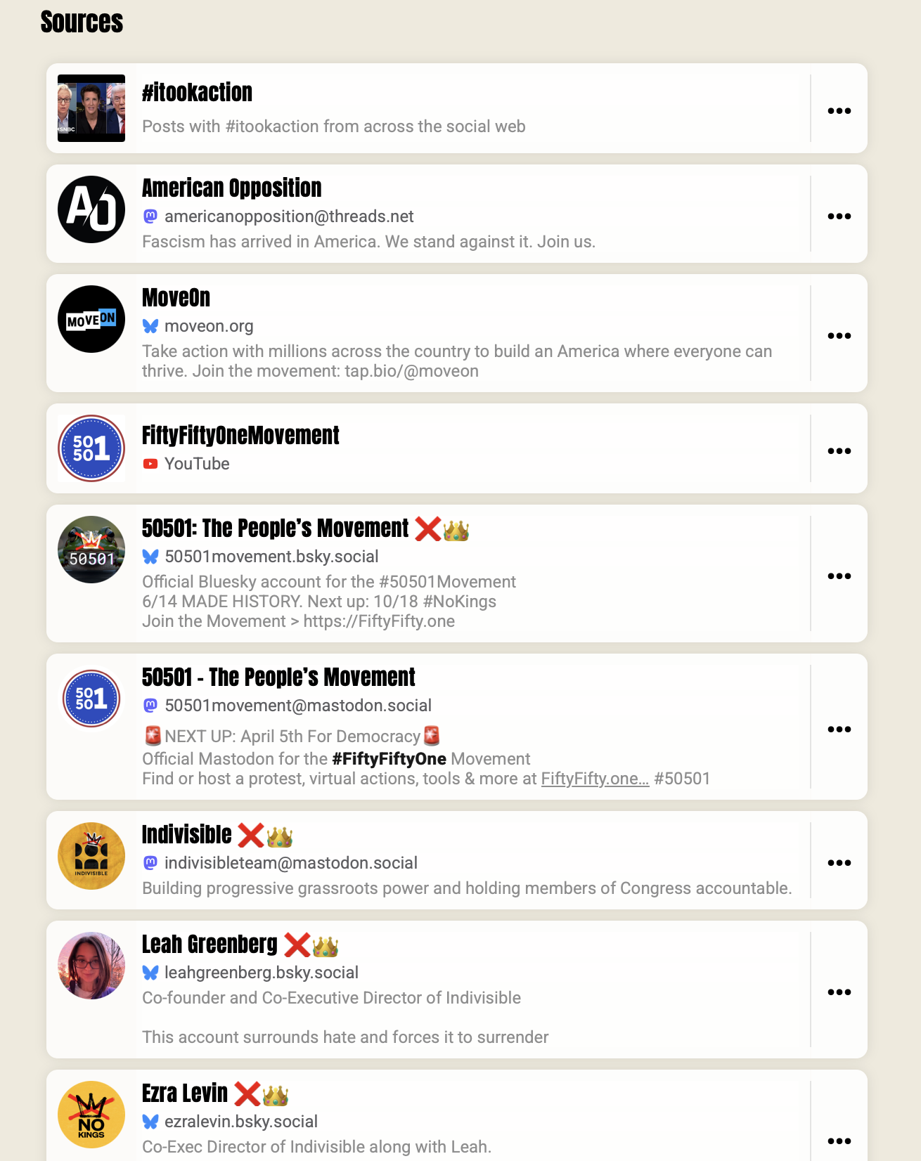 Fantastic Surf feed by @tchambers to follow the #NoKings protests. Unites people posting from across the social web including Mastodon, Bluesky, Threads, YouTube, Ghost, Wordpress and more.