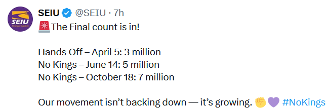 to all the fuckwads claiming #NoKings achieved nothing, then why have the numbers of mostly w̶h̶i̶t̶e̶ Real Americans™ more than doubled?