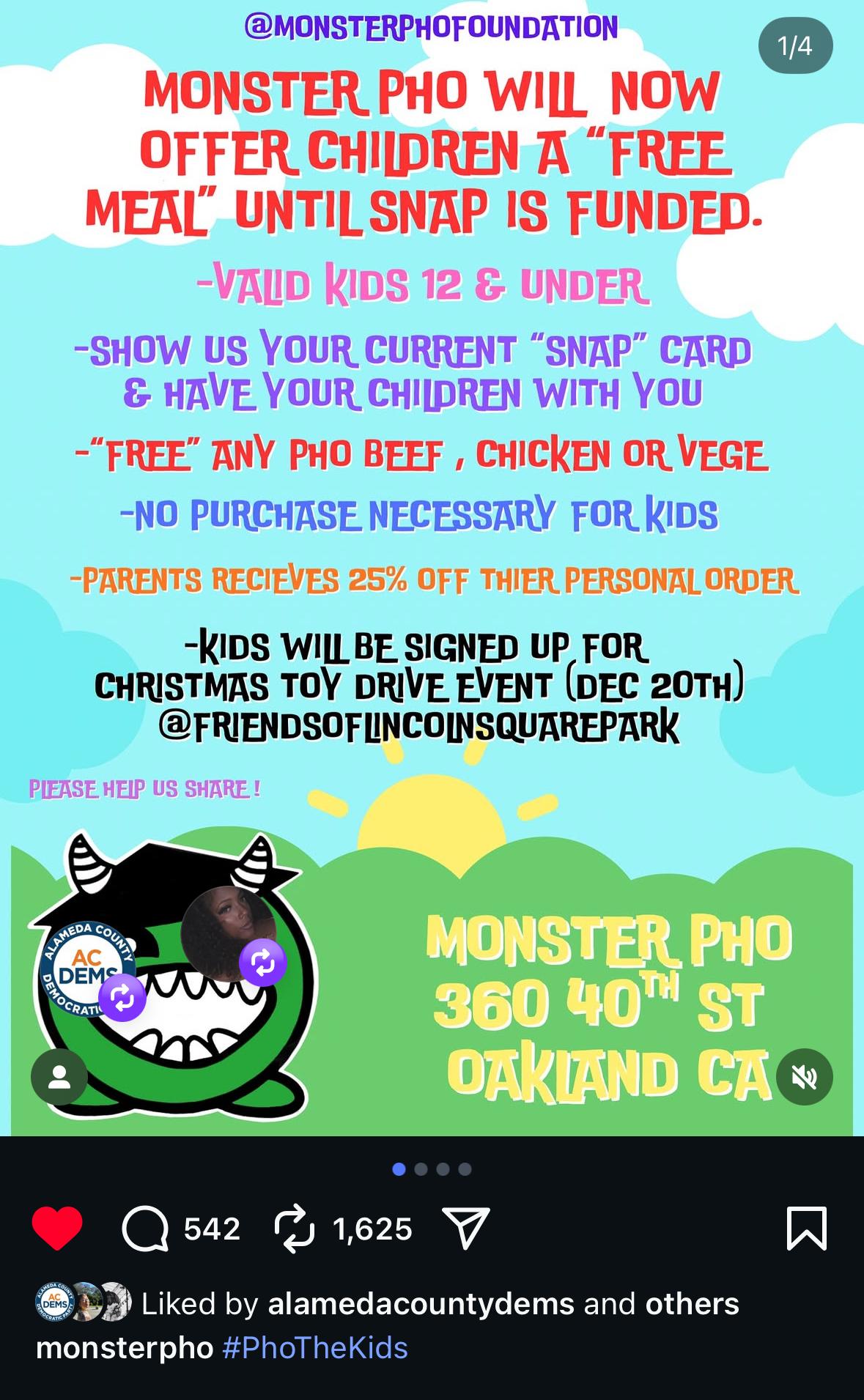 Monster Pho is offering a free meal for kids and 25% off adult meals, for those with SNAP.
