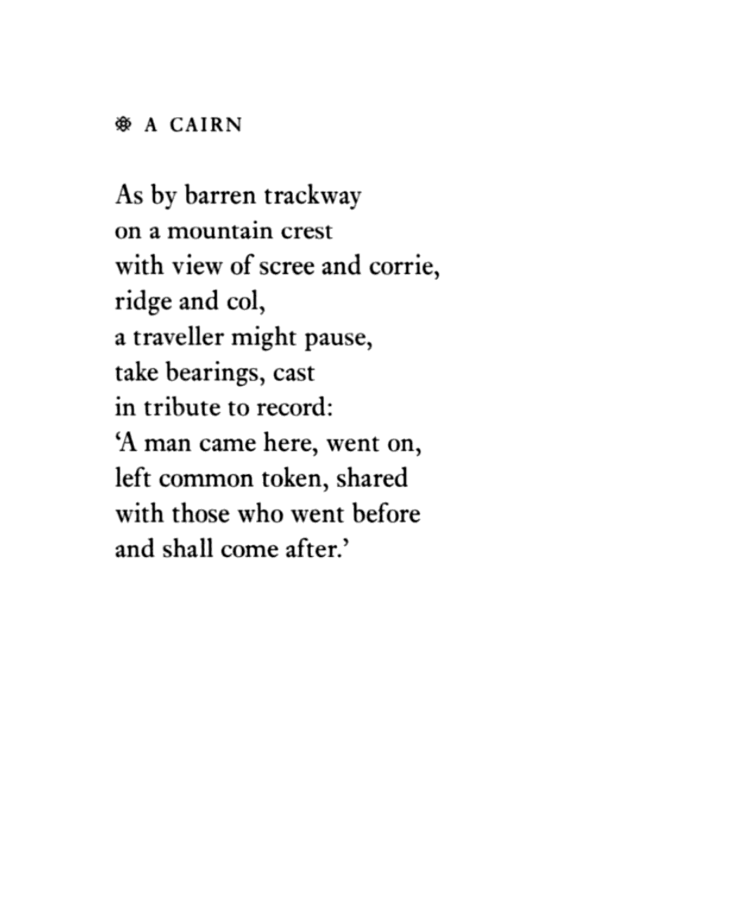 <p>As by barren trackway<br>on a mountain crest<br>with view of scree and corrie,<br>ridge and col,<br>a traveller might pause…</p><p>—“A cairn”, by Gael Turnbull (1928–2004) – born <a href="/tags/otd/" rel="tag">#OTD</a>, 7 April<br>from WHILE BREATH PERSIST (The Porcupine’s Quill, 1992)</p><p>1/3</p><p><a href="https://www.scottishpoetrylibrary.org.uk/poem/cairn/" rel="nofollow" class="ellipsis" title="www.scottishpoetrylibrary.org.uk/poem/cairn/"><span class="invisible">https://</span><span class="ellipsis">www.scottishpoetrylibrary.org.</span><span class="invisible">uk/poem/cairn/</span></a></p><p><a href="/tags/scottish/" rel="tag">#Scottish</a> <a href="/tags/literature/" rel="tag">#literature</a> <a href="/tags/poem/" rel="tag">#poem</a> <a href="/tags/poetry/" rel="tag">#poetry</a></p>