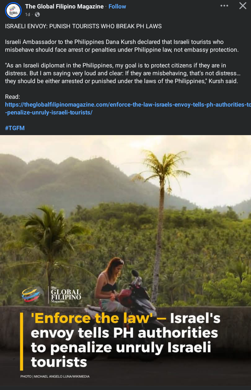 <p><a href="/tags/israel/" rel="tag">#Israel</a> Ambassador to the <a href="/tags/philippines/" rel="tag">#Philippines</a> Dana Kursh declared that Israeli tourists who misbehave shiuld face arrest or penalties under Philippine law, not embassy protection.</p><p><a href="https://theglobalfilipinomagazine.com/enforce-the-law-israels-envoy-tells-ph-authorities-to-penalize-unruly-israeli-tourists/" rel="nofollow" class="ellipsis" title="theglobalfilipinomagazine.com/enforce-the-law-israels-envoy-tells-ph-authorities-to-penalize-unruly-israeli-tourists/"><span class="invisible">https://</span><span class="ellipsis">theglobalfilipinomagazine.com/</span><span class="invisible">enforce-the-law-israels-envoy-tells-ph-authorities-to-penalize-unruly-israeli-tourists/</span></a></p>