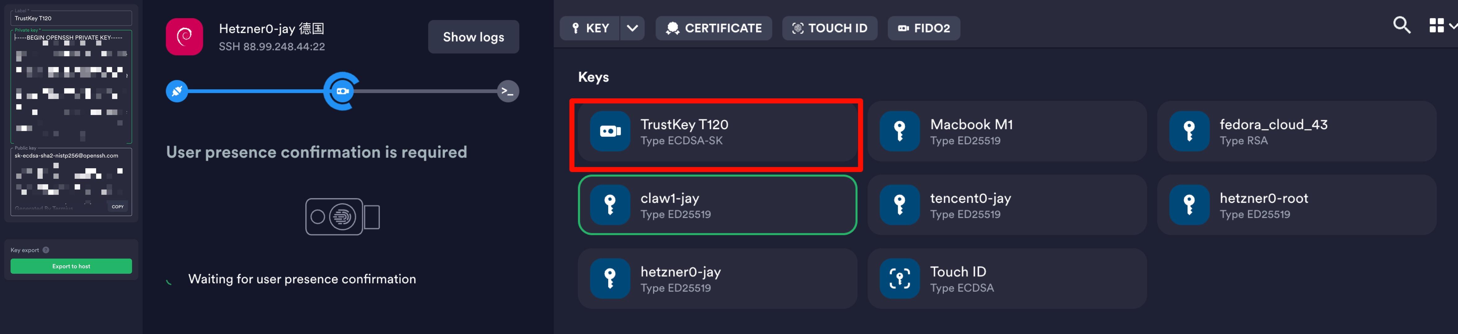 termius上还可以将fido2作为keychain