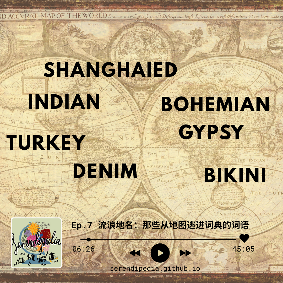 《Serendipedia | 维机游走》新一期节目发布啦!个人非常喜欢这一期的话题哈哈哈😝~这一期我们聊聊那些从地名里长出来的词——语言中的“地域梗”。从被「上海」的水手、被浪漫化的「吉普赛人」,到误打误撞的「火鸡」、「印第安人」,再到瓷器、牛仔裤和比基尼的全球漂流史,我们一起看看地名词如何折射偏见、误会与欲望,如何成为文化、历史和世界的脚注。