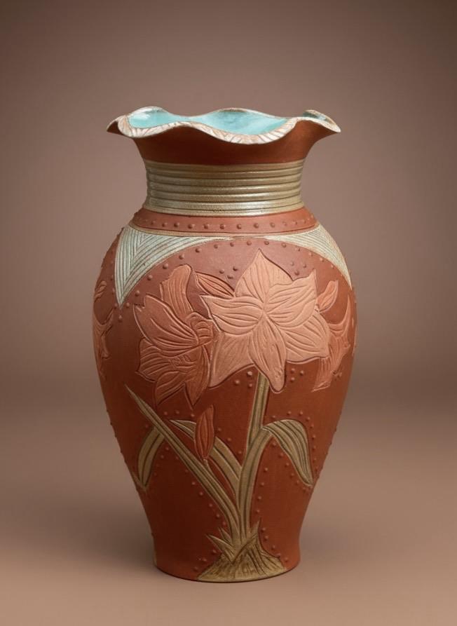 This vase was a custom order for a couple’s 9th wedding anniversary. They wanted something they could pass down to future generations and thought a ceramic piece would make a good commemorative heirloom. They mentioned their love for terracotta amaryllis, a variety I’d never heard of. Terracotta literally means “baked earth” so I was excited to render the flower in clay tones using a mixture of pink Alabama #clay and a clay called Newman Red from California. #pottery