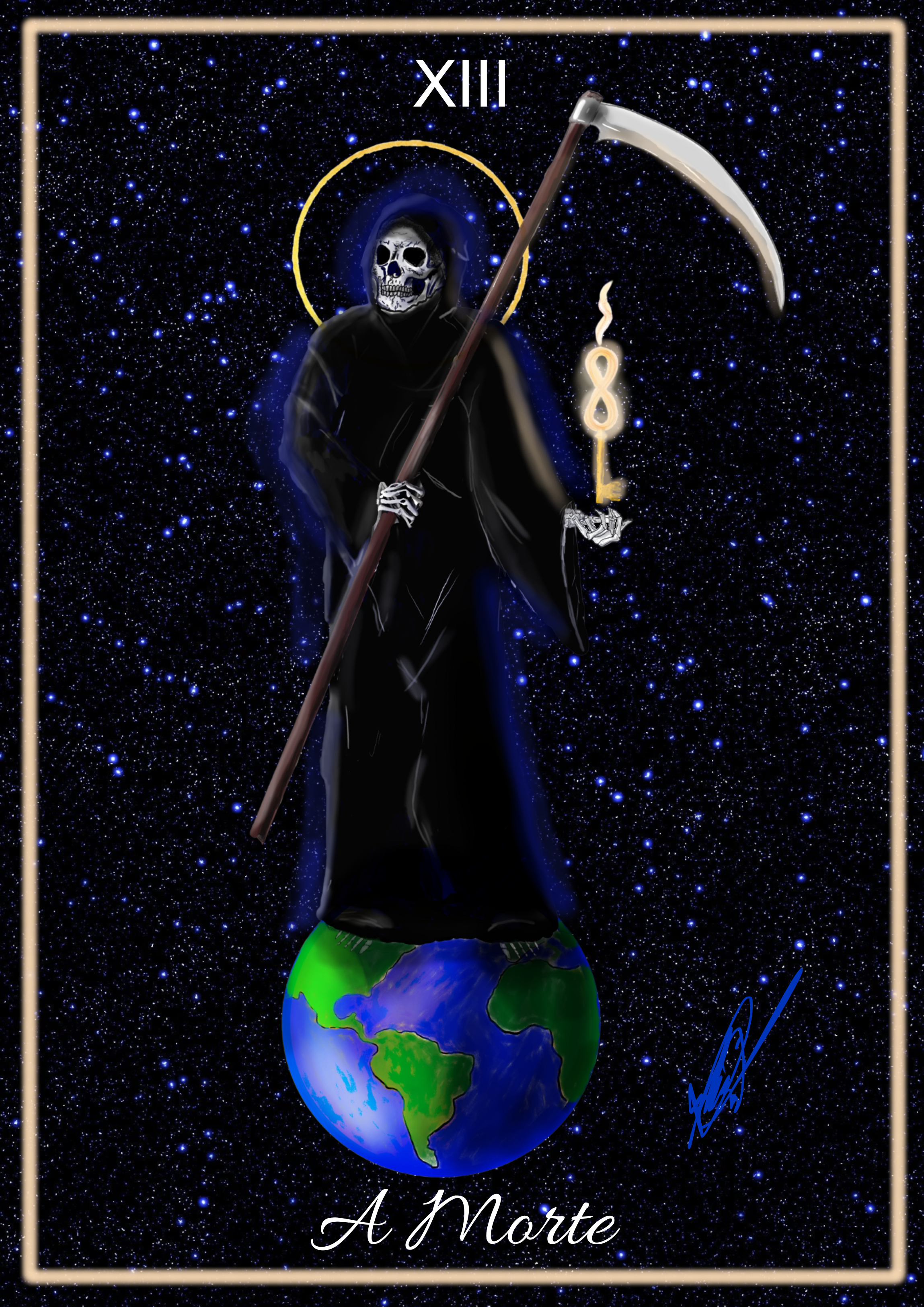 Utilizei várias referências para desenhar, já que provavelmente esse é o primeiro desenho que faço nos últimos dois anos. O tema é Tarô e fiz esse tendo como base a carta "A Morte".