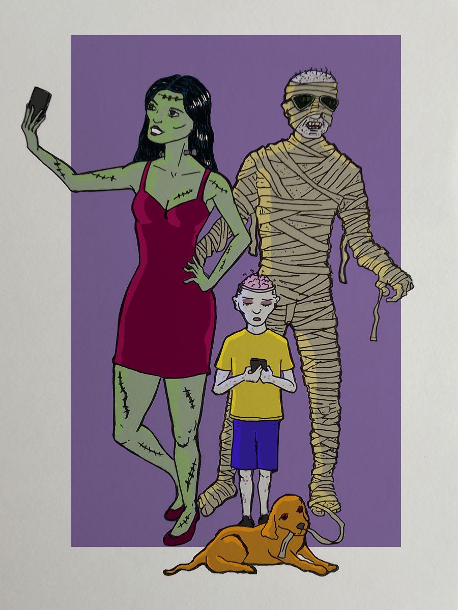 Pensei em fazer só uma múmia na caneta, acabei com uma família monstro. Depois de tirar a foto empolguei e colori no krita.
