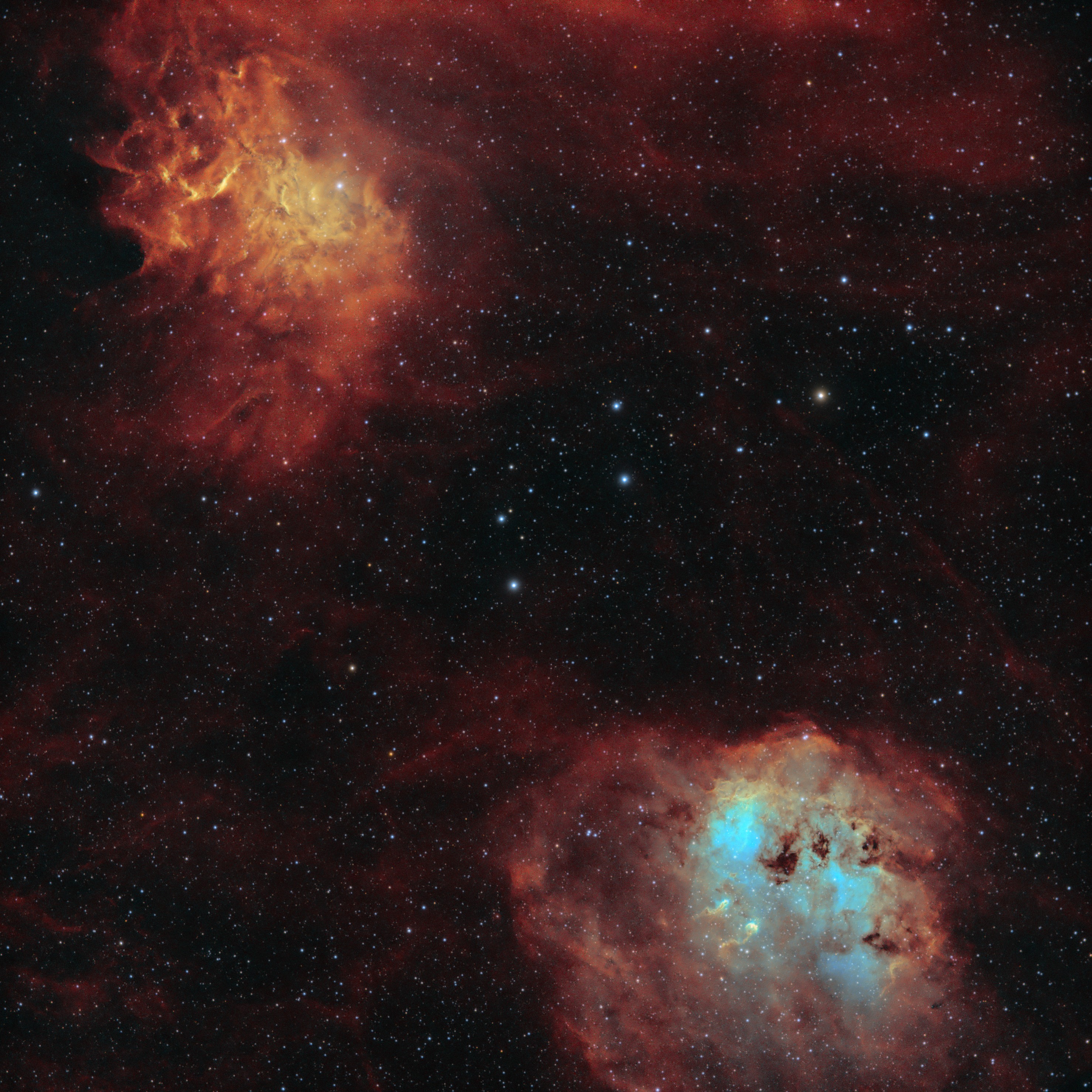 It could probably stand to have a few more hours of data, but this came out pretty nice, especially all the surrounding nebulosity. though I wish my field of view was slightly wider so I could fit the extremities of both nebulae.