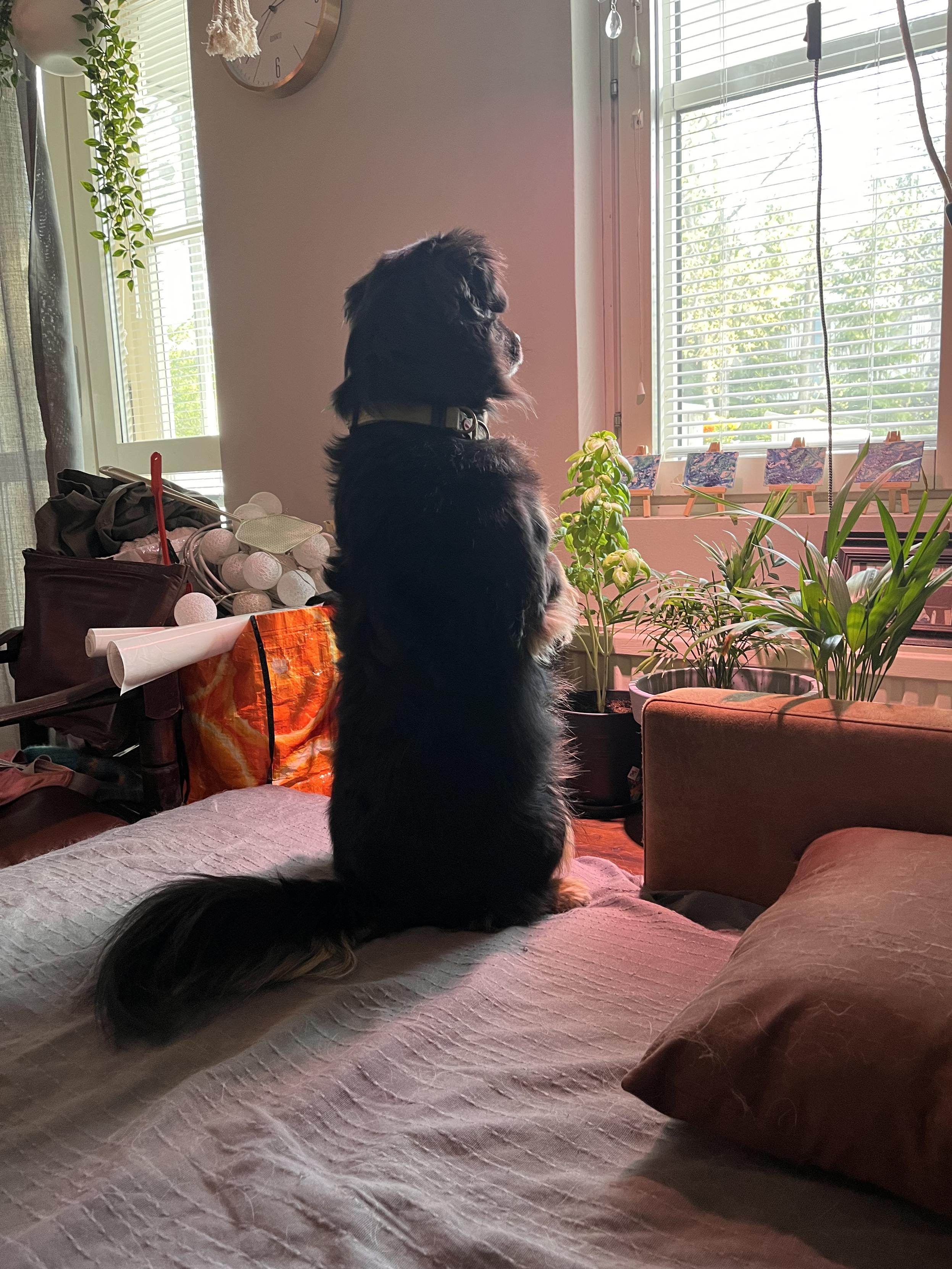 Here is Camu in May 2025, doing a squirrel — or maybe more of a mongoose type of move — to see if the person who just banged the car door is indeed his bestie (my partner) or just some vandal who needs to be barked at 😆❤️