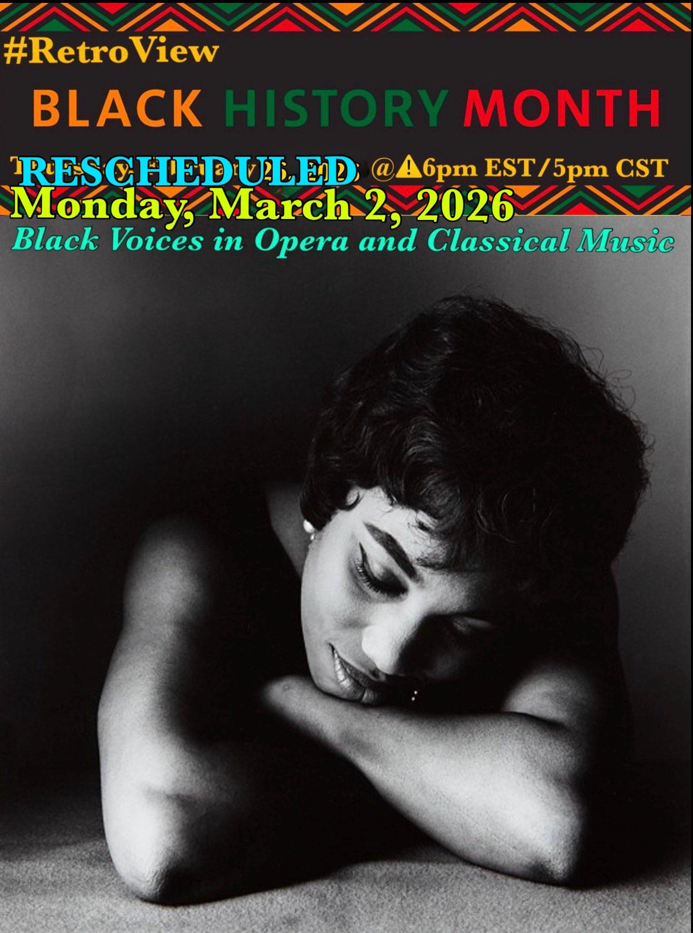 Join me for a⚠️SUPER SPECIAL⚠️ #RetroView on MONDAY AKA TODAY @ 6pm EST/5pm ST with a rescheduled “Black Voices in Opera, Musical Theater and Classical Music Playlist” available here (https://youtube.com/playlist?list=PL2Zslnc5XTfuI0edTJfxfX0s-HCIiqCek&si=xPMW_eQ77nsf3E1x) You can pre-game with a compilation of previous playlists here (https://youtube.com/playlist?list=PL2Zslnc5XTfuwbe4ljEfZfu_1bnaDhca3&si=wa3ahwmSa7lhsQlT) I will see y’all there💕