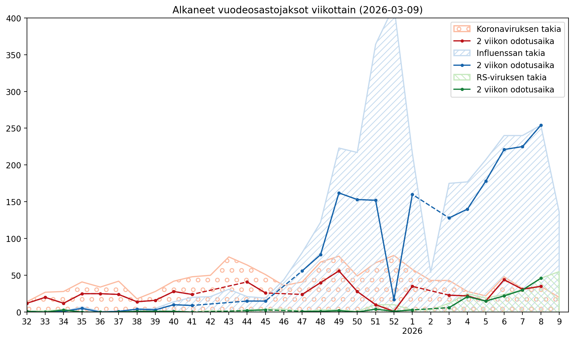 RSV kasvussa. Influenssa on kÀÀntynyt laskuun viikon 8 jÀlkeen, mutta influenssan takia alkaneita vuodeosastojaksoja on ollut senkin jÀlkeen runsaasti.