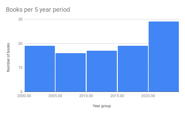 How much more likely were people to vote for books because they had read them in recent memory (recency bias)? You would expect that good books are spread out evenly across the years, but it's hard to remember books that you read many years ago! Turns out there was an even spread of books across 2000-2019. But there were 40% more books than expected from 2020-2024. (See first graph.)