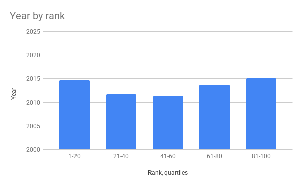 Were newer books more likely to be lower down the list? I thought this might be lkely because votes for recently read books might spread out more. But that wasn't completely true. The bottom 40 of the list did lean new, but so did the top 20. (See second graph.)