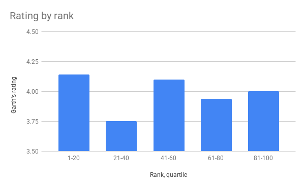 How did the list compare with my own ratings? I've read 57 of the 100 books, and I did rate higher books better, but the relationship was very weak. (See third graph.)