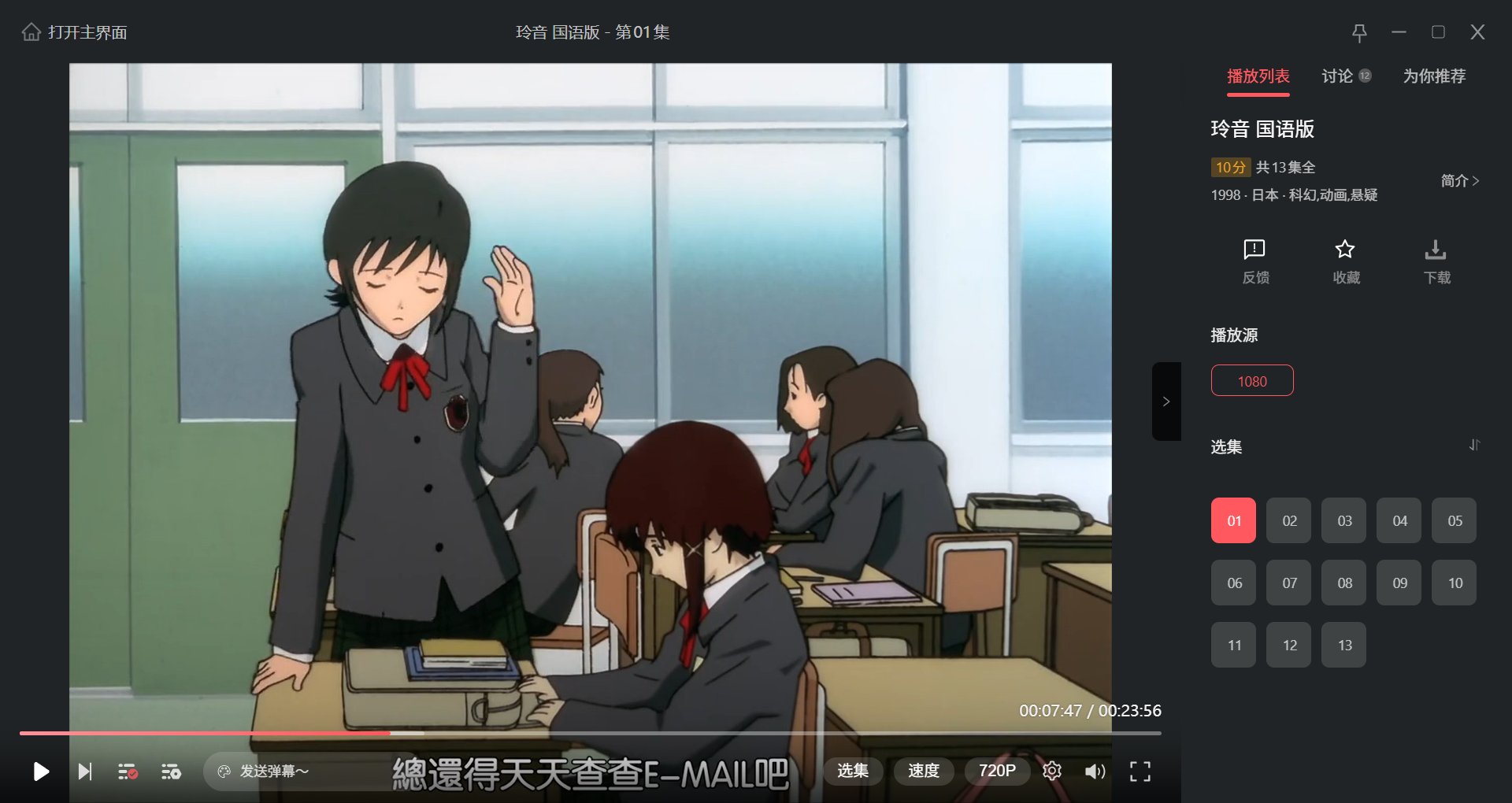 一位哔哩哔哩网友告诉我,在盗版动漫平台heibai弹幕上可以找到1998年日本实验性动漫《玲音》的中配版片源。该版本拥有高清画质,且内嵌了繁体中文字幕,但是音质极差。
