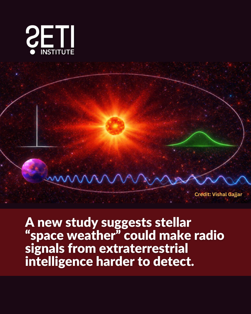 A new study by researchers at the SETI Institute suggests stellar “space weather” could make radio signals from extraterrestrial intelligence harder to detect. Stellar activity and plasma turbulence near a transmitting planet can broaden an otherwise ultra-narrow signal, spreading its power across more frequencies and making it more difficult to detect in traditional narrowband searches.