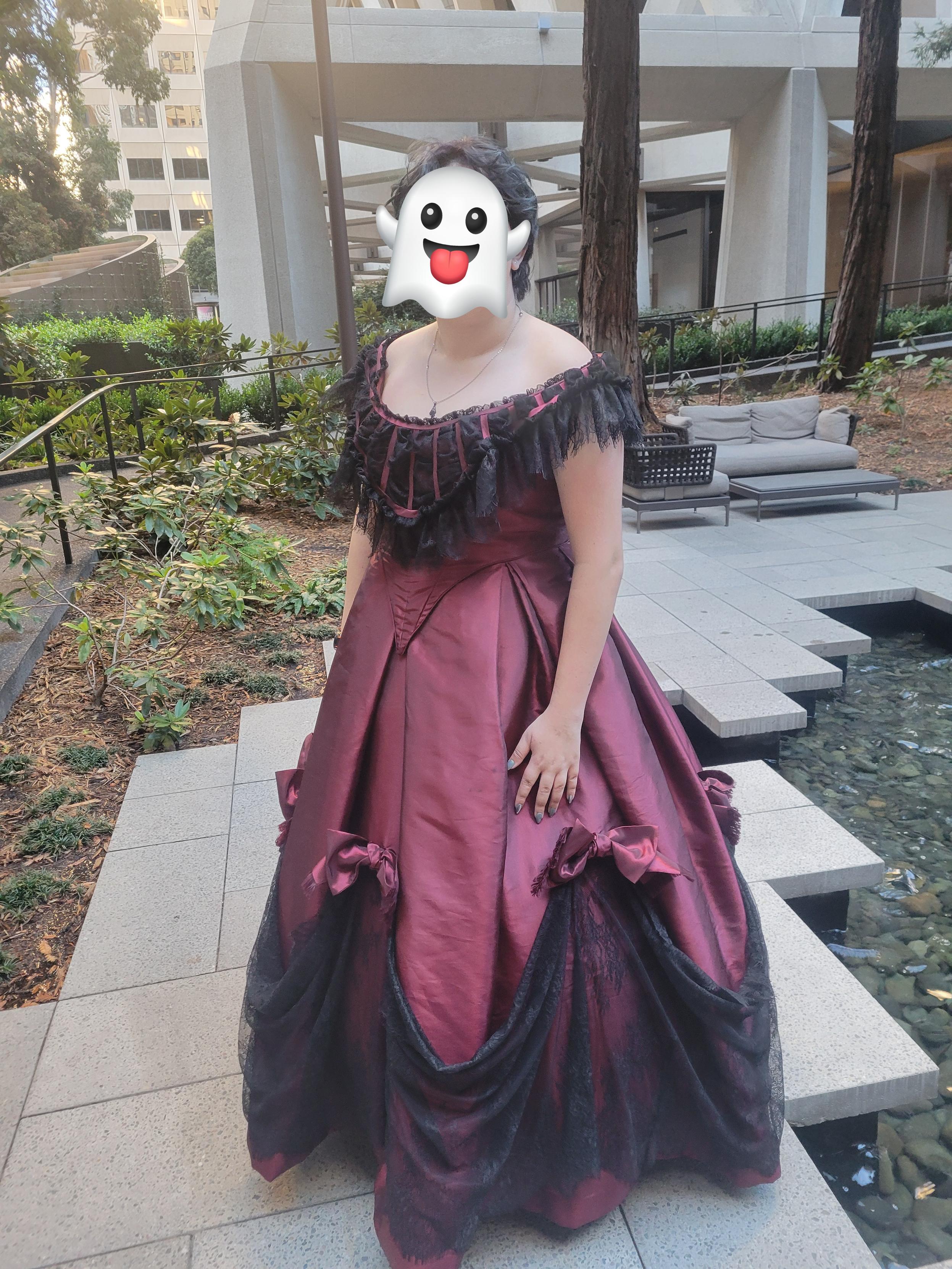I copied a gown from 1865, but changed the colors to suit the "emo Victorian vibe" kiddo was going for. The changeable taffeta glows shocking red in the sunlight, but the black undertones come out otherwise.