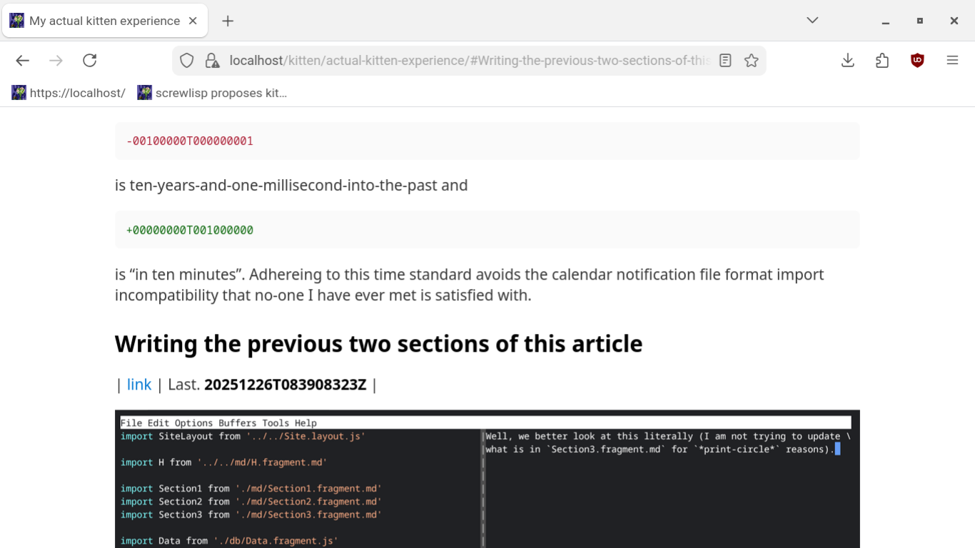 What I discovered is that #webdev -ing an article "properly" which is to say using all the features your framework provides (i.e. https://kitten.small-web.org/ ) absorbs an absolute ton of extra work. Comparable to being formal in mathematics. I am interested in how that extra work exposes my own articles to me better later.