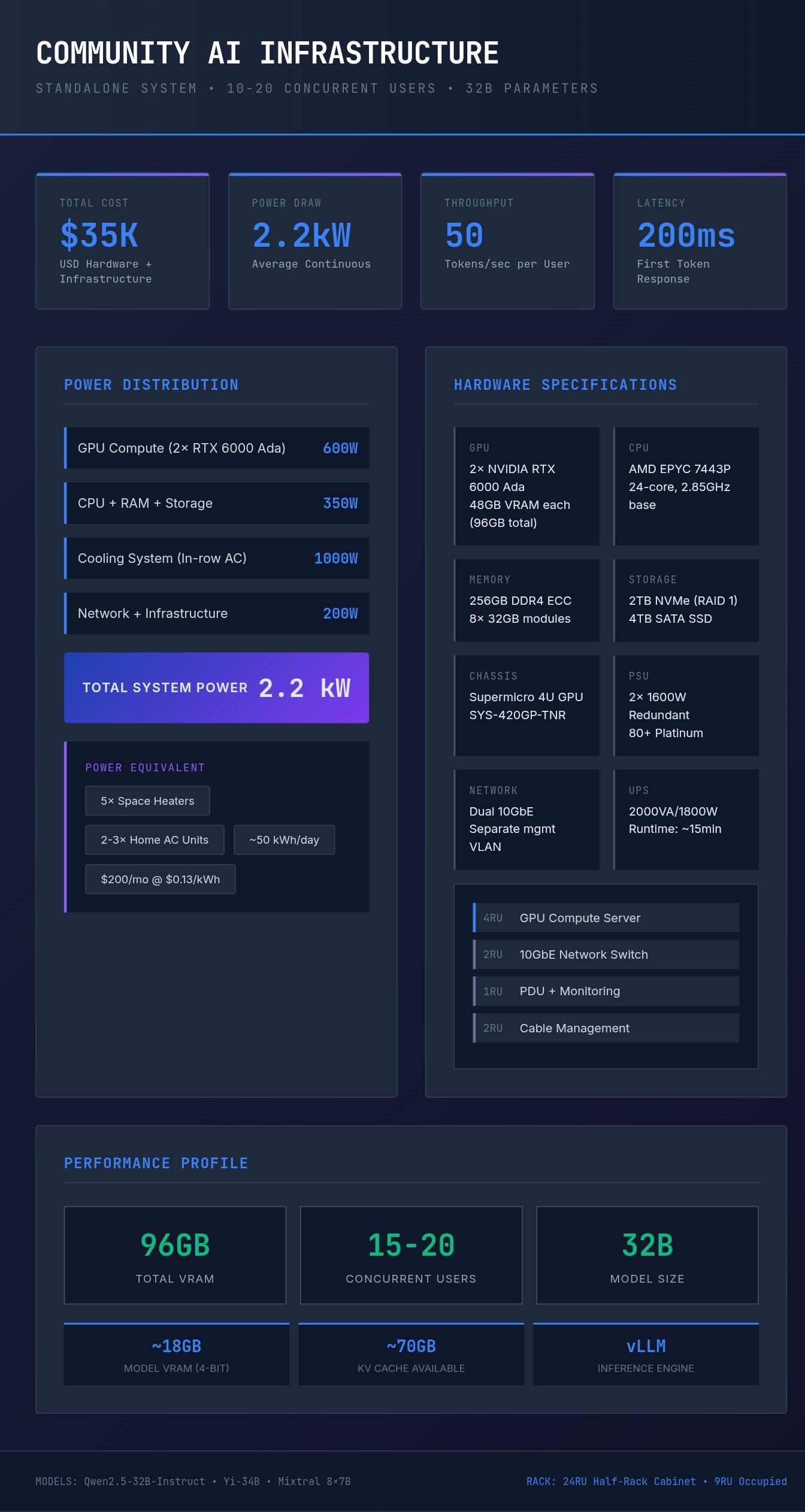 A 32billion parameters, frontier level performance compatable open source #llm model. The power requirements is that of 3AC units including cooling. Serves 15-20 concurrent users. 40 households of 4 people each (taking into account actual AI model distributed use metrics and contention ratios)