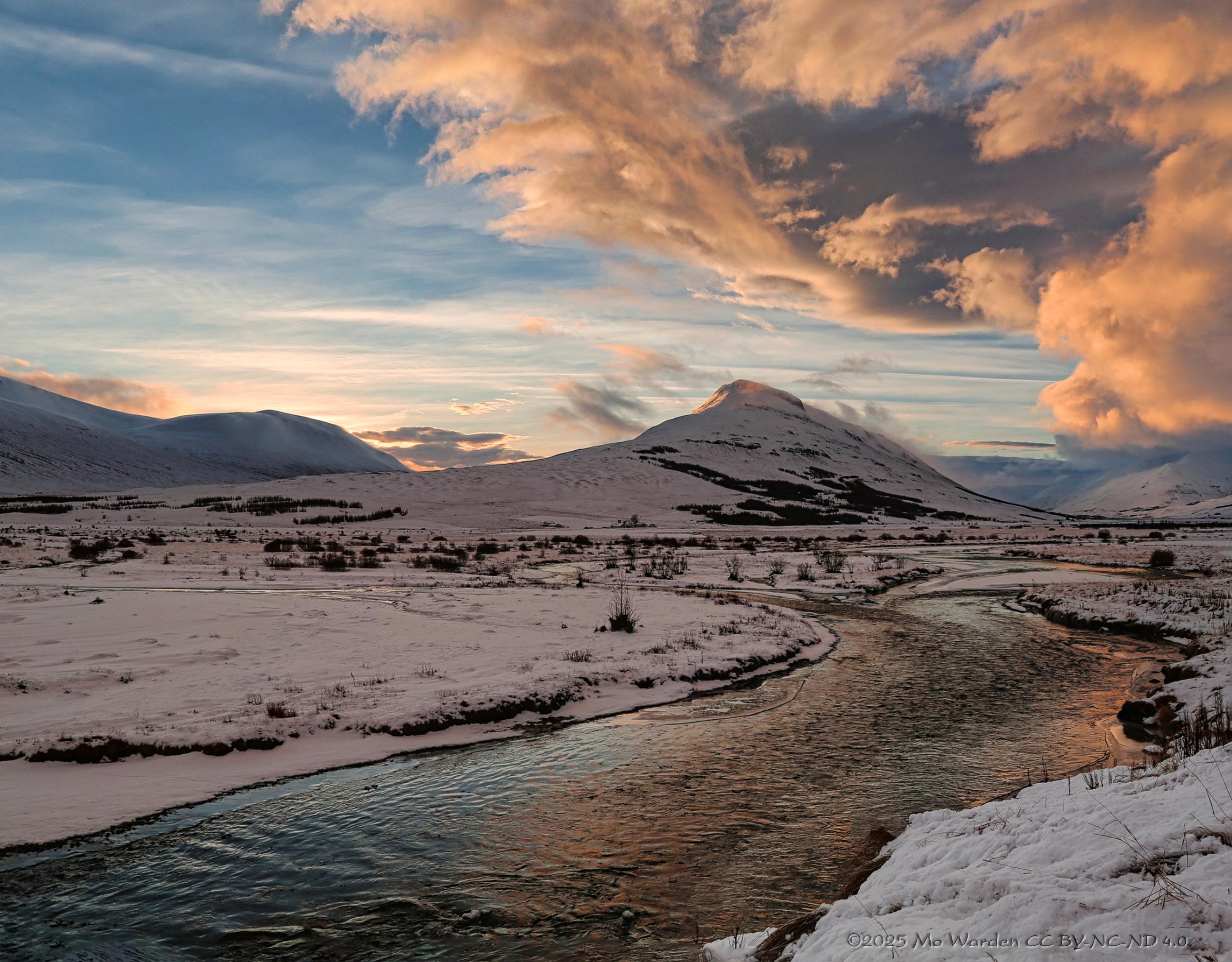Following the swift river upstream, we paused where the early light kissing the clouds was reflected in the icy waters.