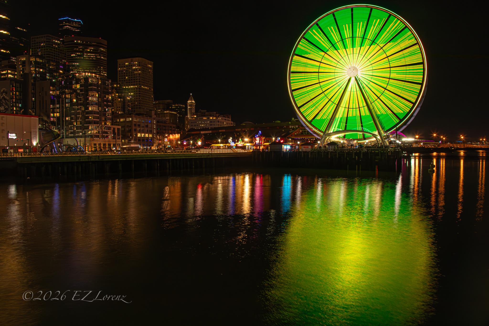 Prints, Cards and more : https://ez-lorenz.pixels.com/featured/the-seattle-great-wheels-light-display-for-st-patricks-day-ez-lorenz.html