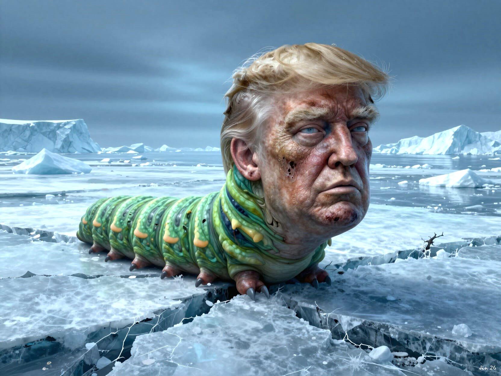 Today's cartoon ... another from my hungry caterpillar series, as the gobbling #Trumpigula threatens the Euros in his sleazy attempt to steal Greenland. Is this any way to treat your friends? https://time.com/7346949/trump-greenland-tariffs-threat/ #USFascism #AIart #cartoons