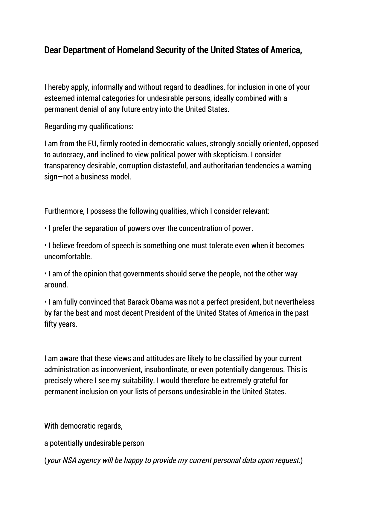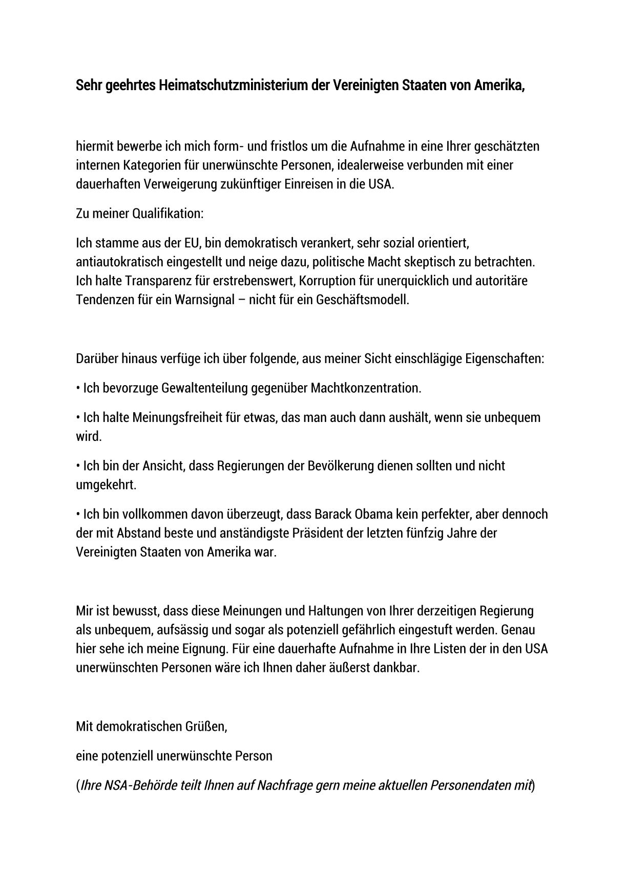 Hab’ jetzt gerade mal eine Bewerbung für das Heimatschutzministerium der USA geschrieben.