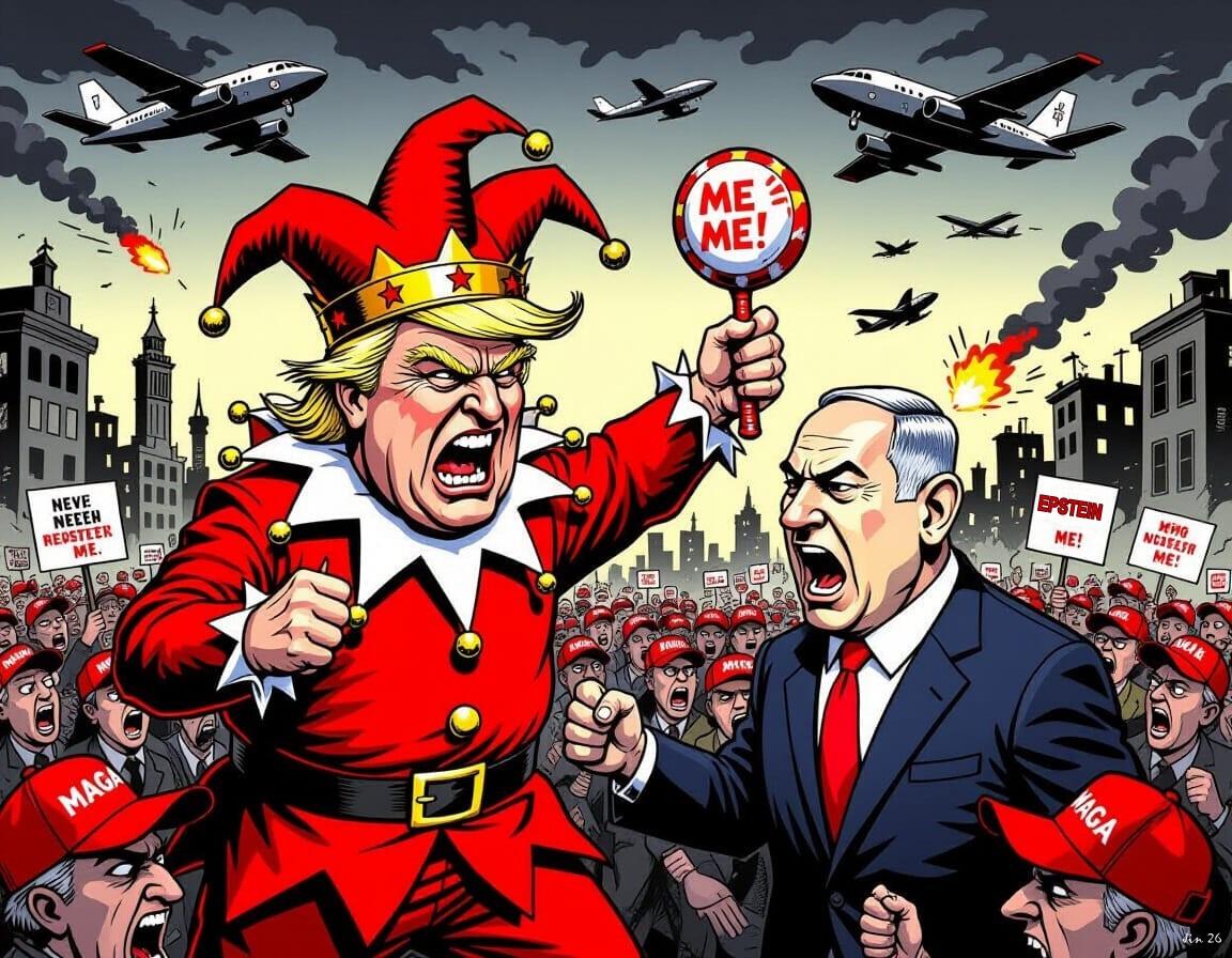A Tale of Two Felons - Operation Epic Fool and Roaring Liar - bombing for freedom from court cases. My cartoon for today. #USFascism #IsraelFascism #USBasesOut #StopIsrael #Iran #AIart