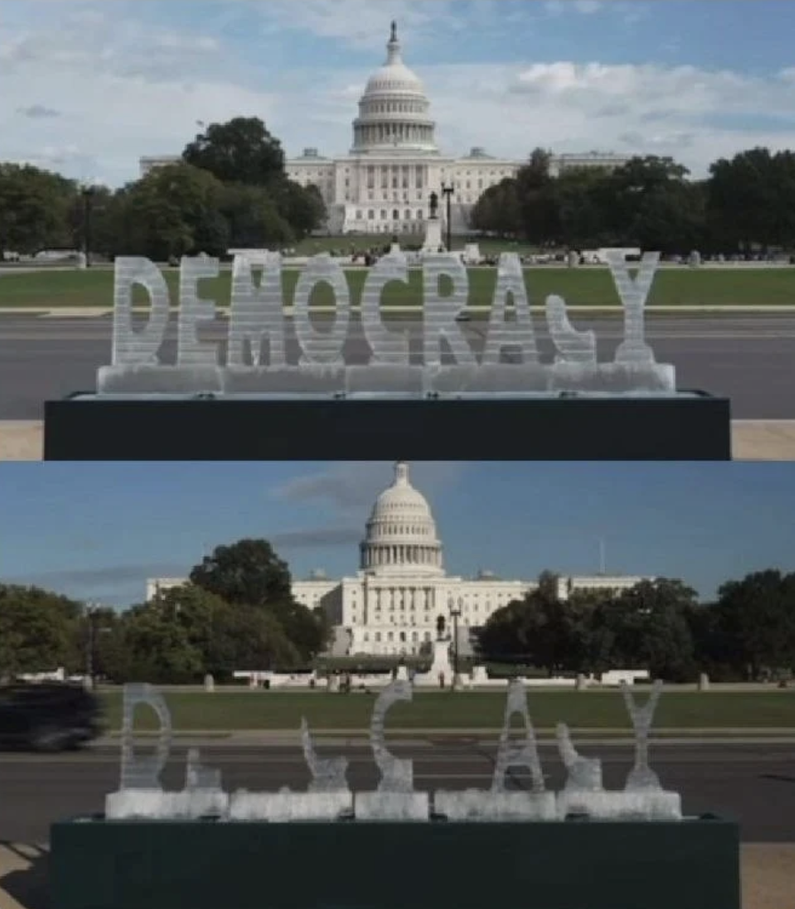 The Liberal protest perfected: no disruption, no action, just a melting 'Democracy' sculpture at the Capitol. Silent, temporary, and gone by noon.