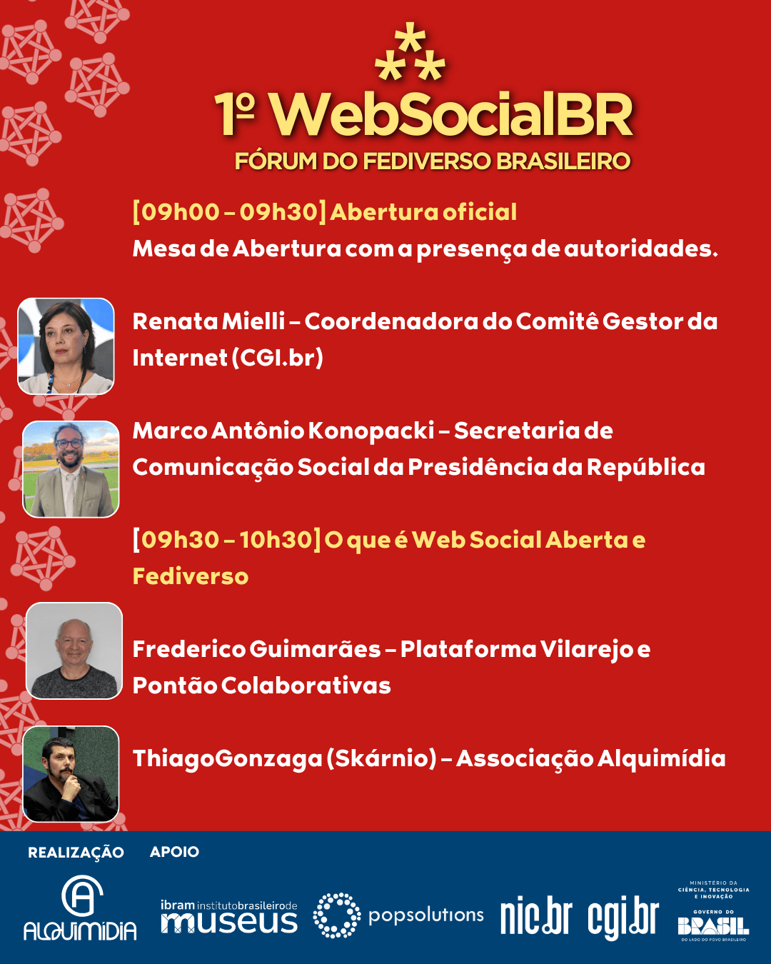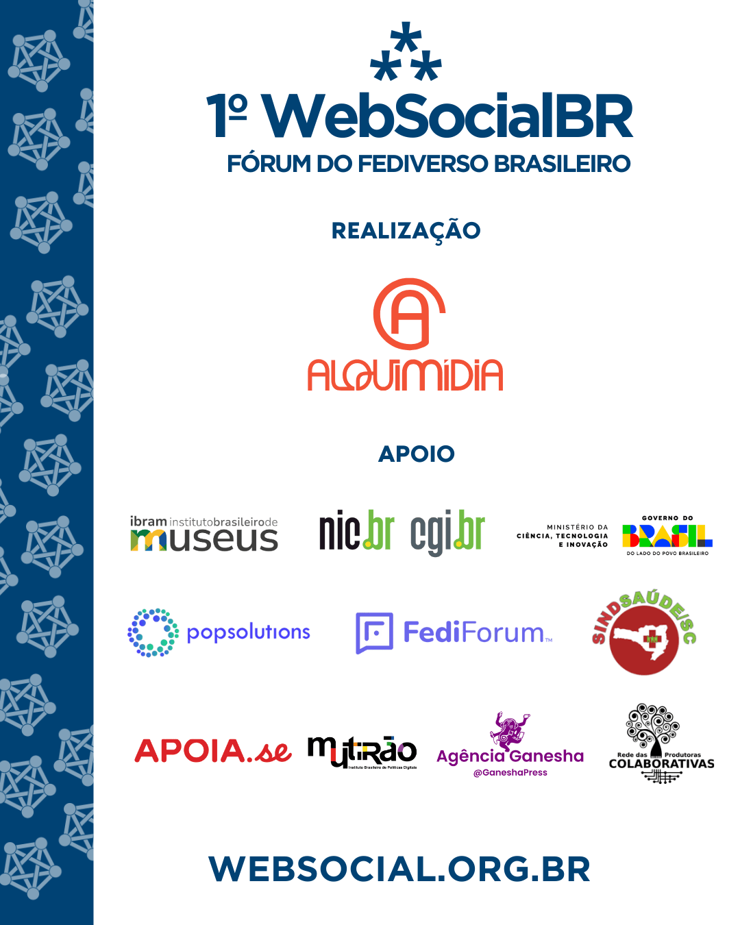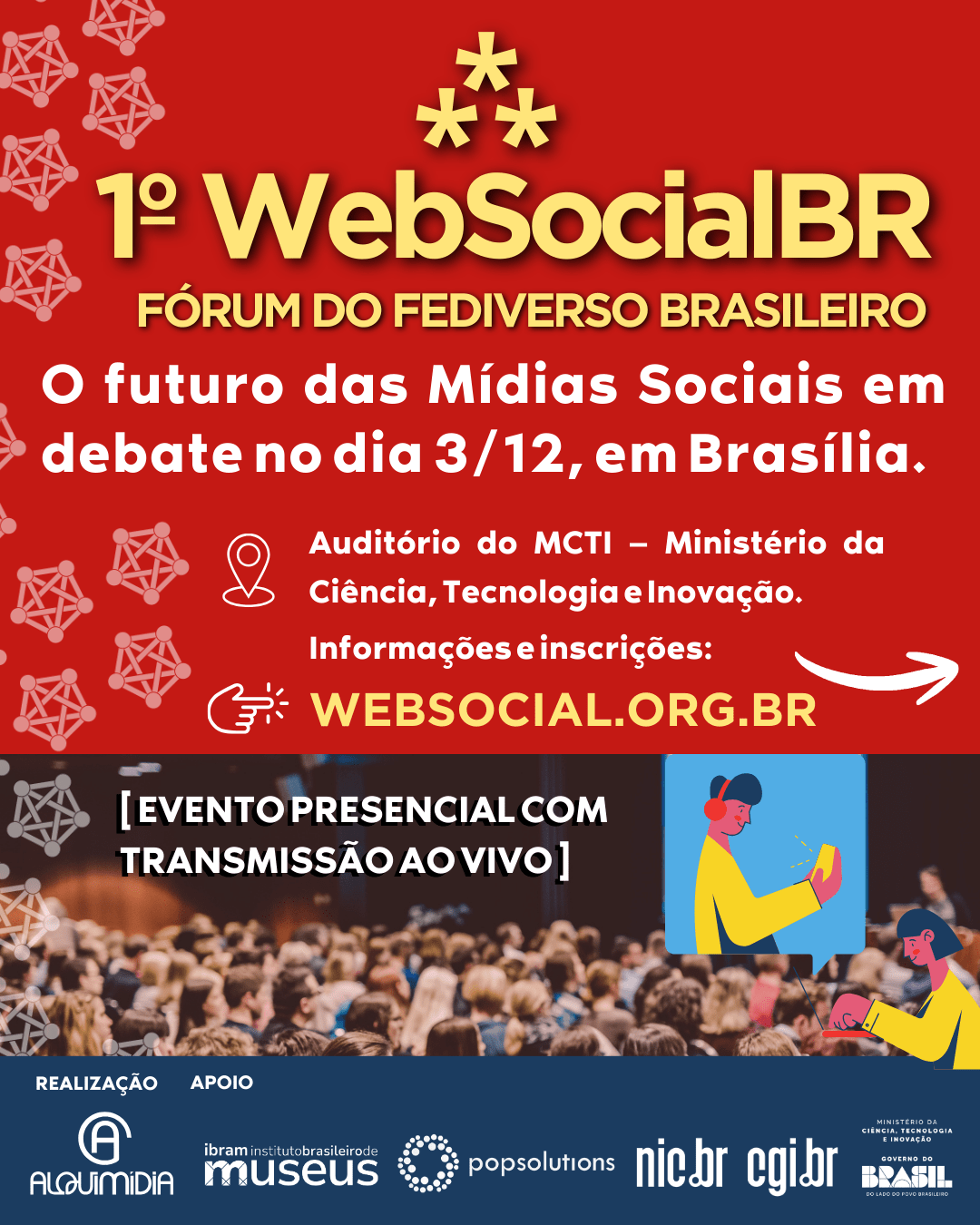 No dia 3/12, Brasília sedia o 1º @websocialbr – Fórum do #Fediverso Brasileiro, evento que reunirá administradores de comunidades, gestores, parlamentares, pesquisadores e comunicadores para trocar experiências e fortalecer as redes federadas no Brasil. Inscreva-se e divulgue: https://websocial.org.br