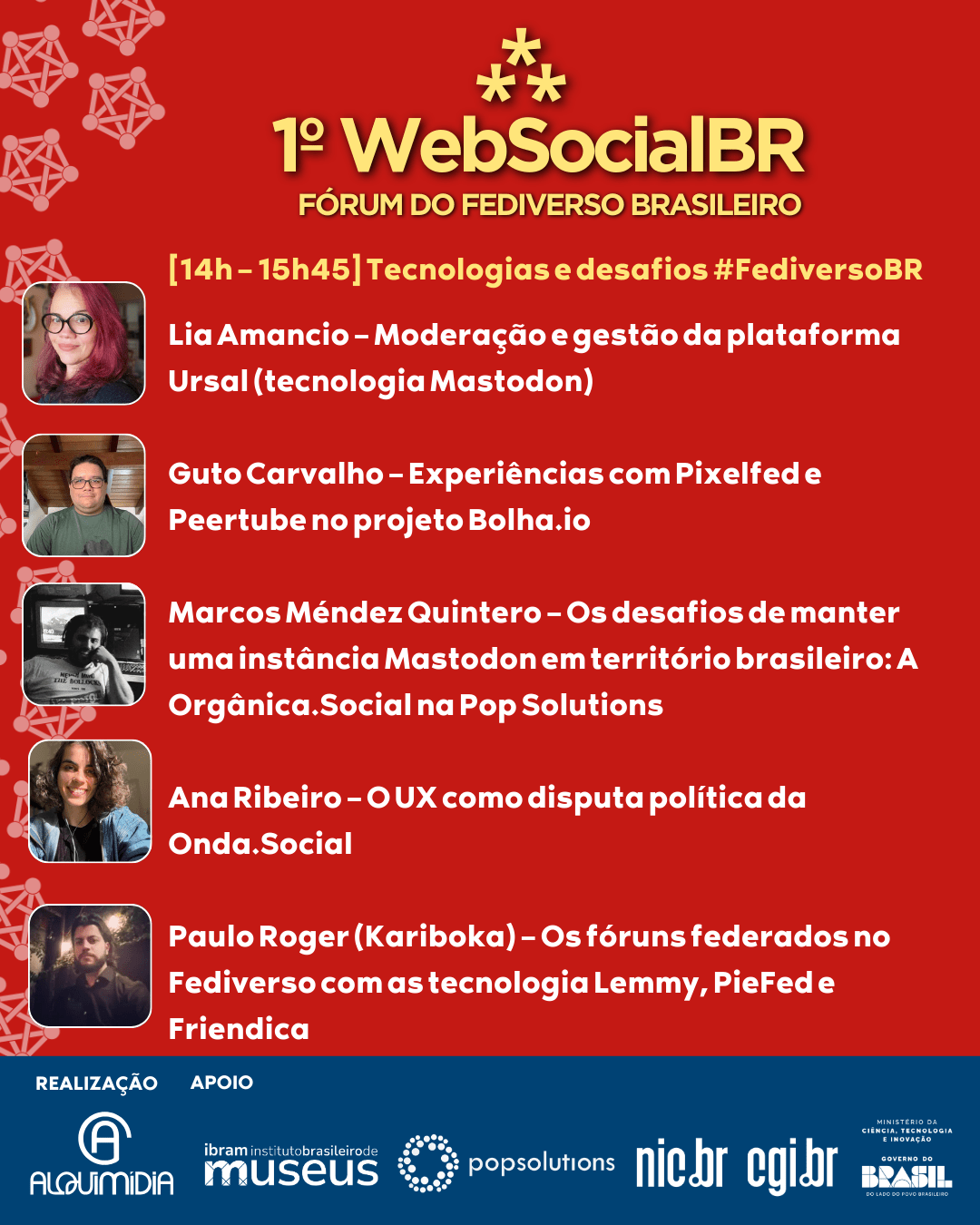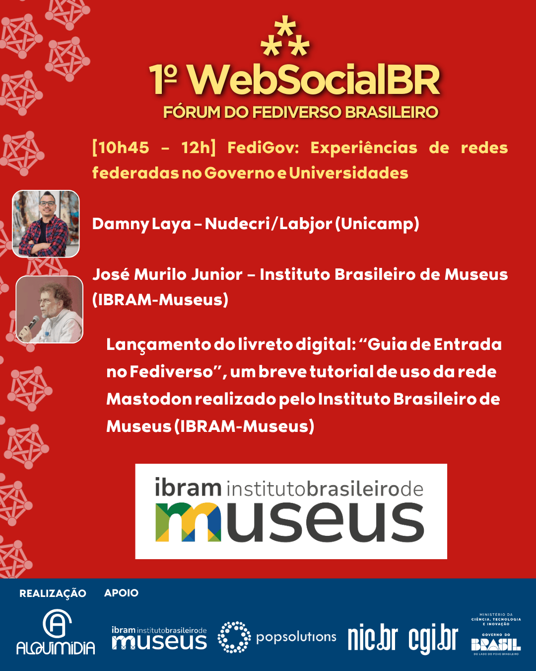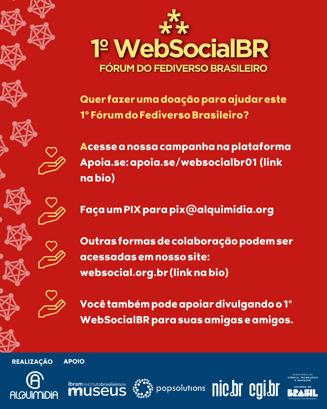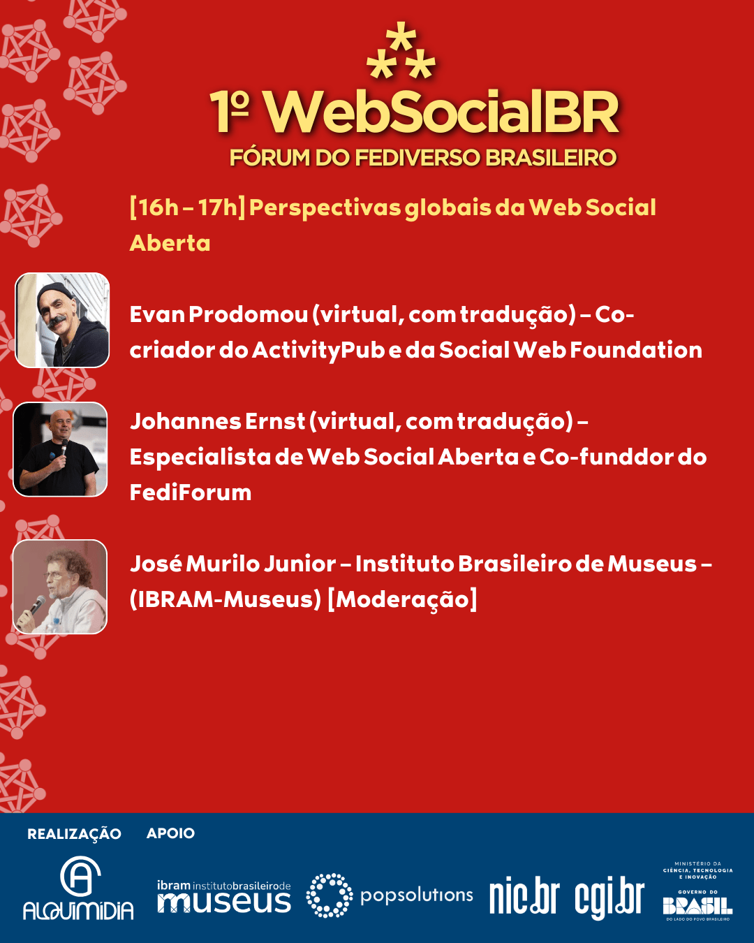 No dia 3/12, Brasília sedia o 1º @websocialbr – Fórum do #Fediverso Brasileiro, evento que reunirá administradores de comunidades, gestores, parlamentares, pesquisadores e comunicadores para trocar experiências e fortalecer as redes federadas no Brasil. Inscreva-se e divulgue: https://websocial.org.br