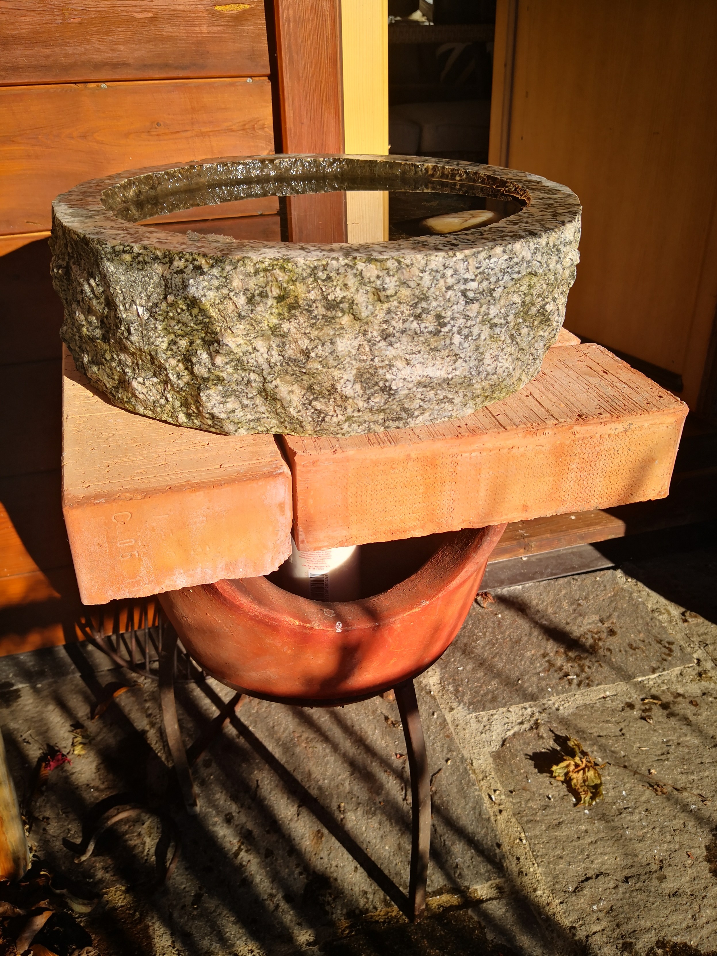Ich biete meinen gefiederten Gästen seit letztem Jahr eine beheizte #Vogeltränke. Self-made. Letztes Jahr mit Ziegel, diesmal nutze ich eine Terracotta Ofen / Grill. Unten ein 10 Tage Grablicht.
